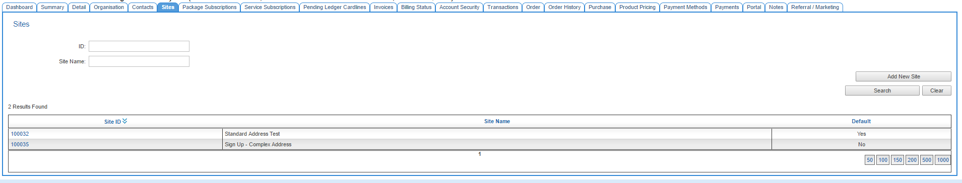 Search for and locate the agent's customer account. Click on the ID of the account to open the Customer Screen. Click on the Sites tab. The Sites list will be displayed.