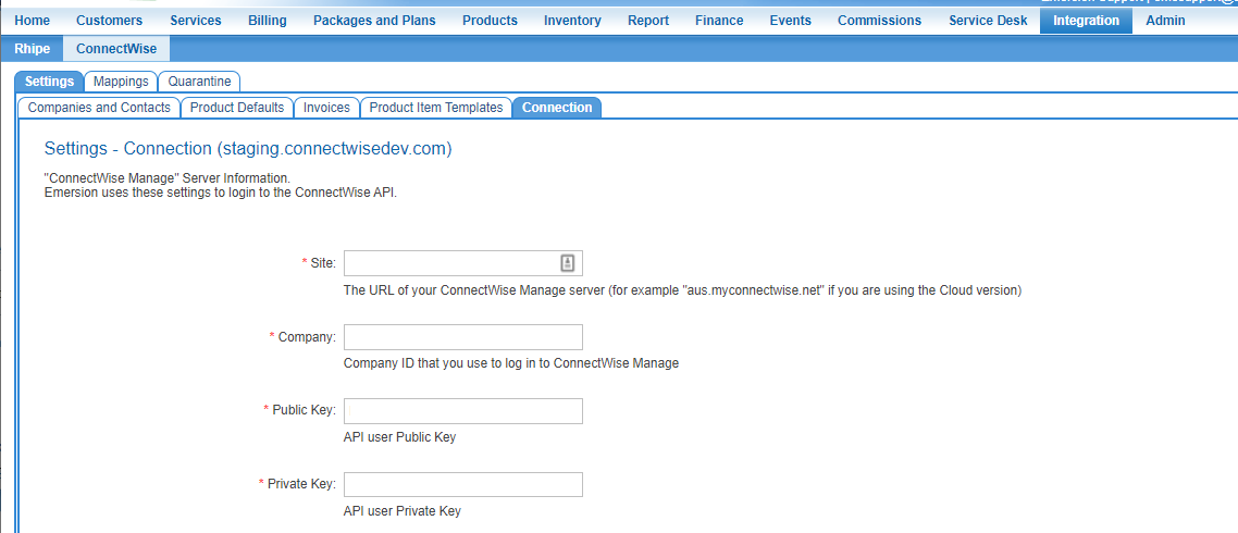 The ConnectWise Integration Connection settings page enables the integration between Emersion and ConnectWise to occur.