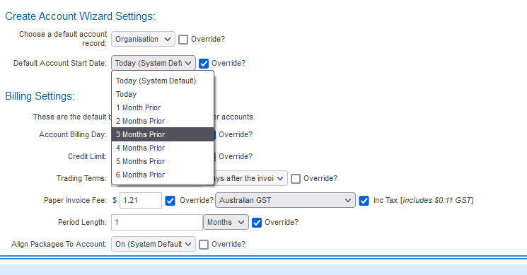 In the image to the right, the Default Account Start Date is being set to 3 months prior.