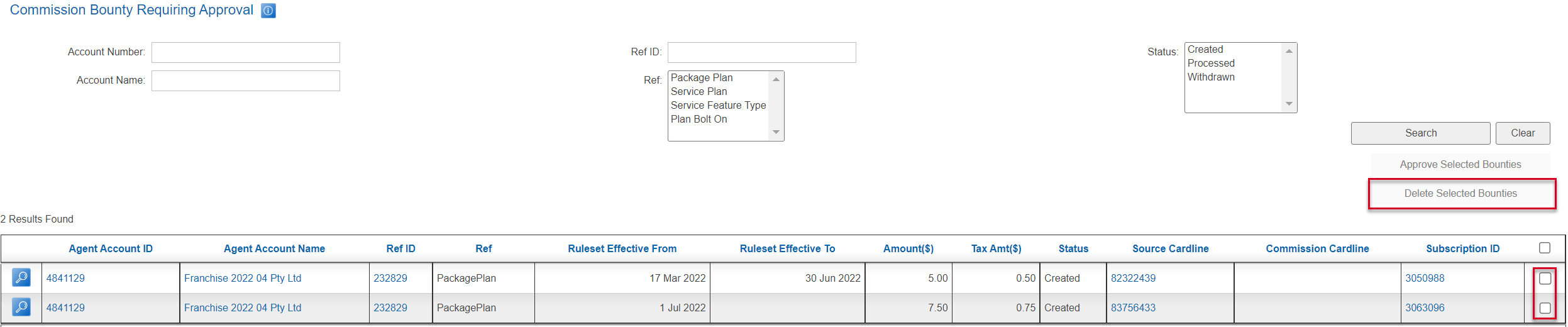Press the Delete Selected Bounties* button to delete all the selected commissions.