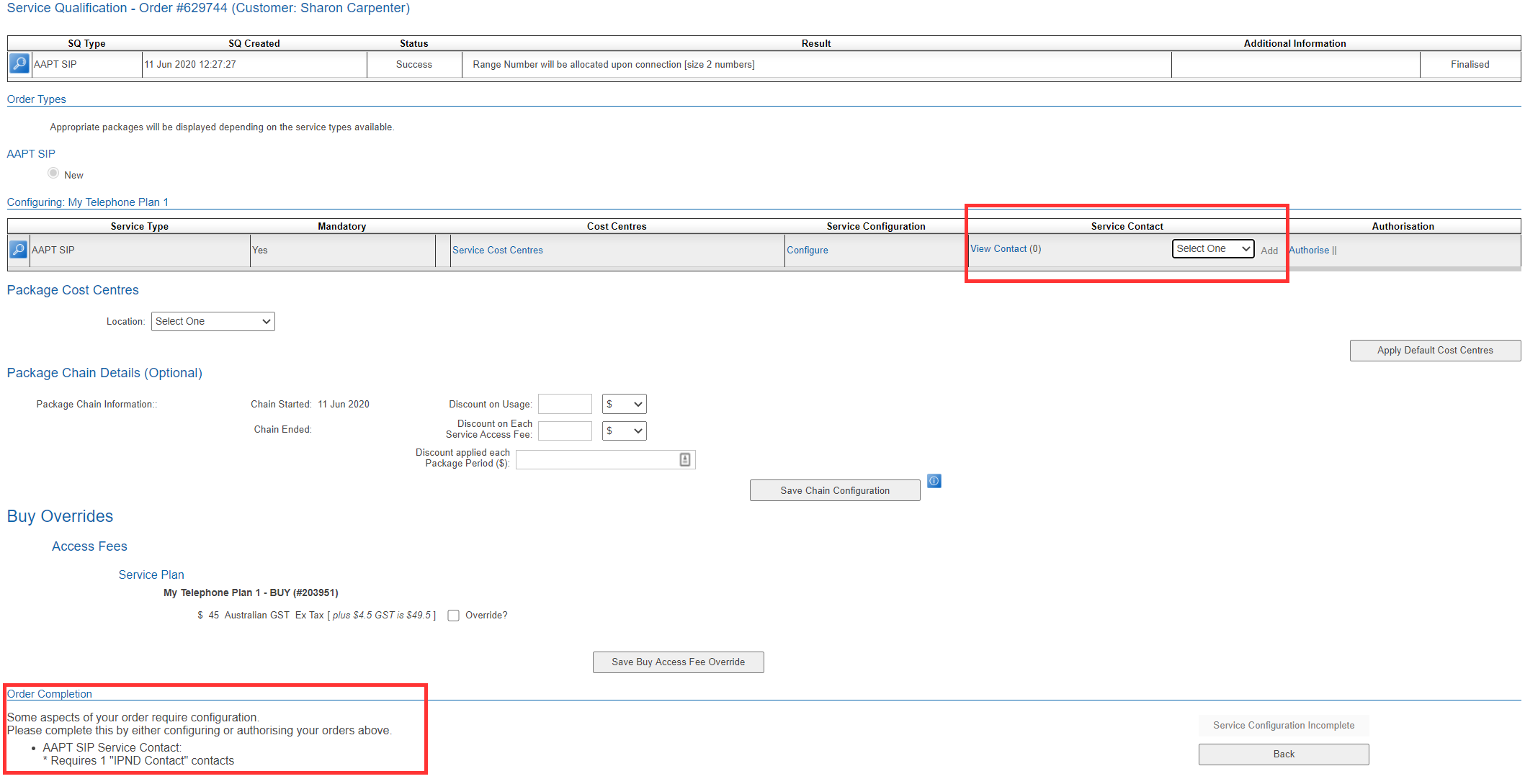 Progress the order until the Service Configuration section (shown below) is presented. The user will see some on-screen indicators related to the IPND contact and the Order Completion requirements. They are marked in Red.