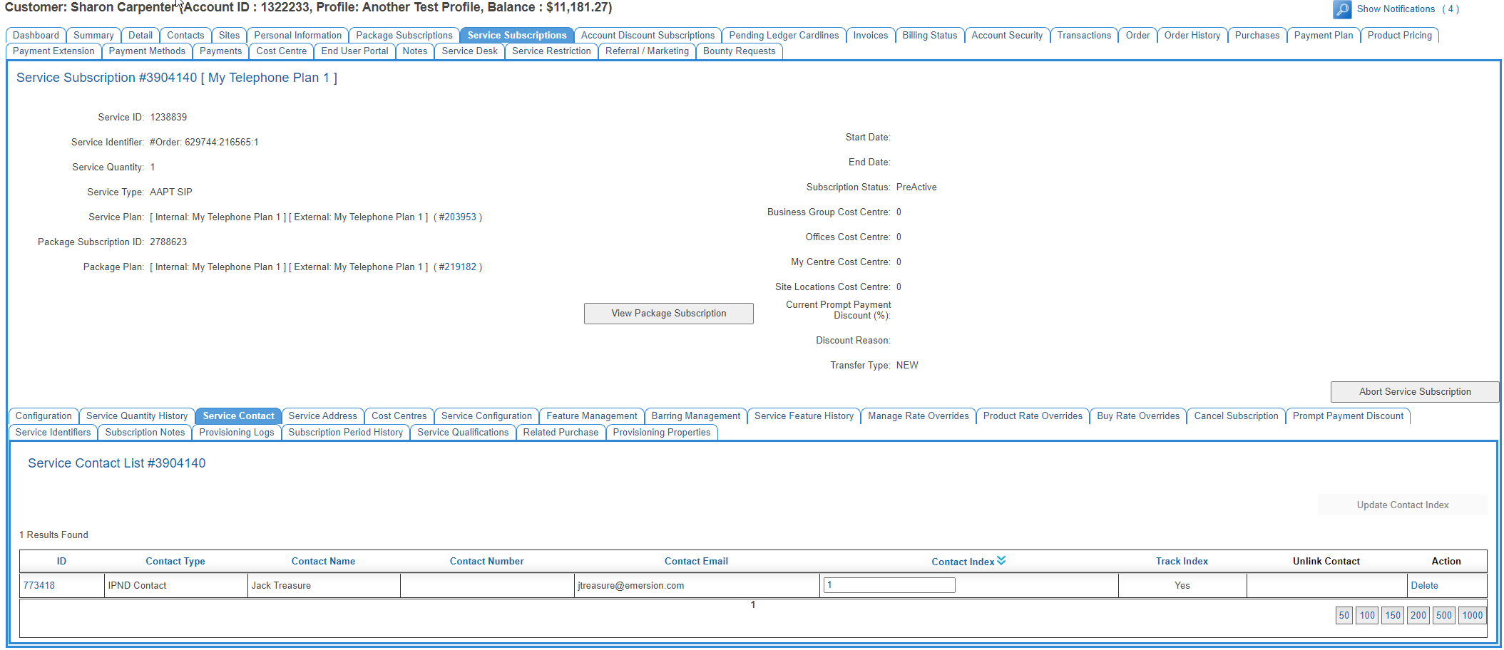 The user will be taken back to the Service Configuration section of the order. The user knows the contact is saved when a 1 appears in brackets. This number tells users how many service contacts are stored within the order.