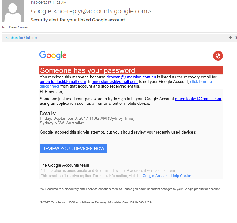 Gmail and Gmail for Business subscribers need to be aware of an additional layer of security in Google's Gmail architecture. This security layer is designed to prevent authentication attempts from an client (mobile device, computer, tablet, etc) who has not already been authenticated and "Is known" by the mailbox account (and therefore safe). This includes any authentication requests by Emersion for the purposes of retrieving emails in order to create tickets.