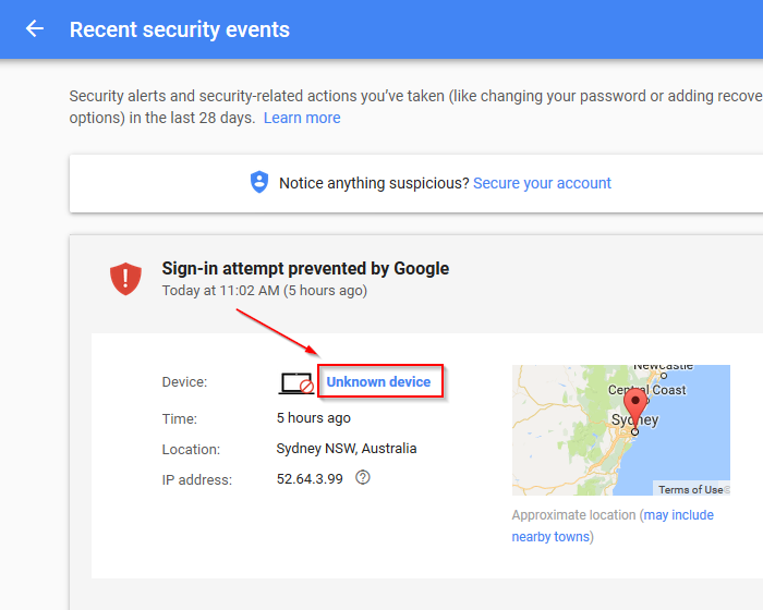 - Click the unknown device link. It will look something like https://myaccount.google.com/device-activity/nt/1504832549000)