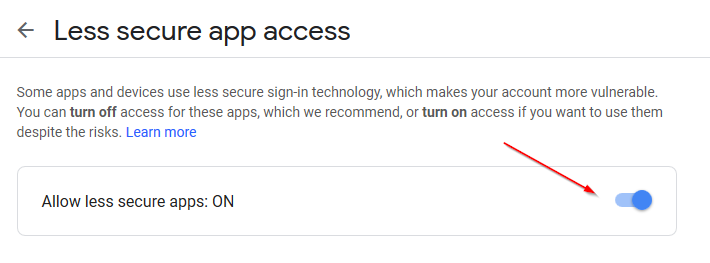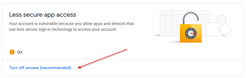 - Scroll down to Less secure app access section and click Turn on access (not recommended) - Alternatively, simply navigate directly to https://myaccount.google.com/lesssecureapps