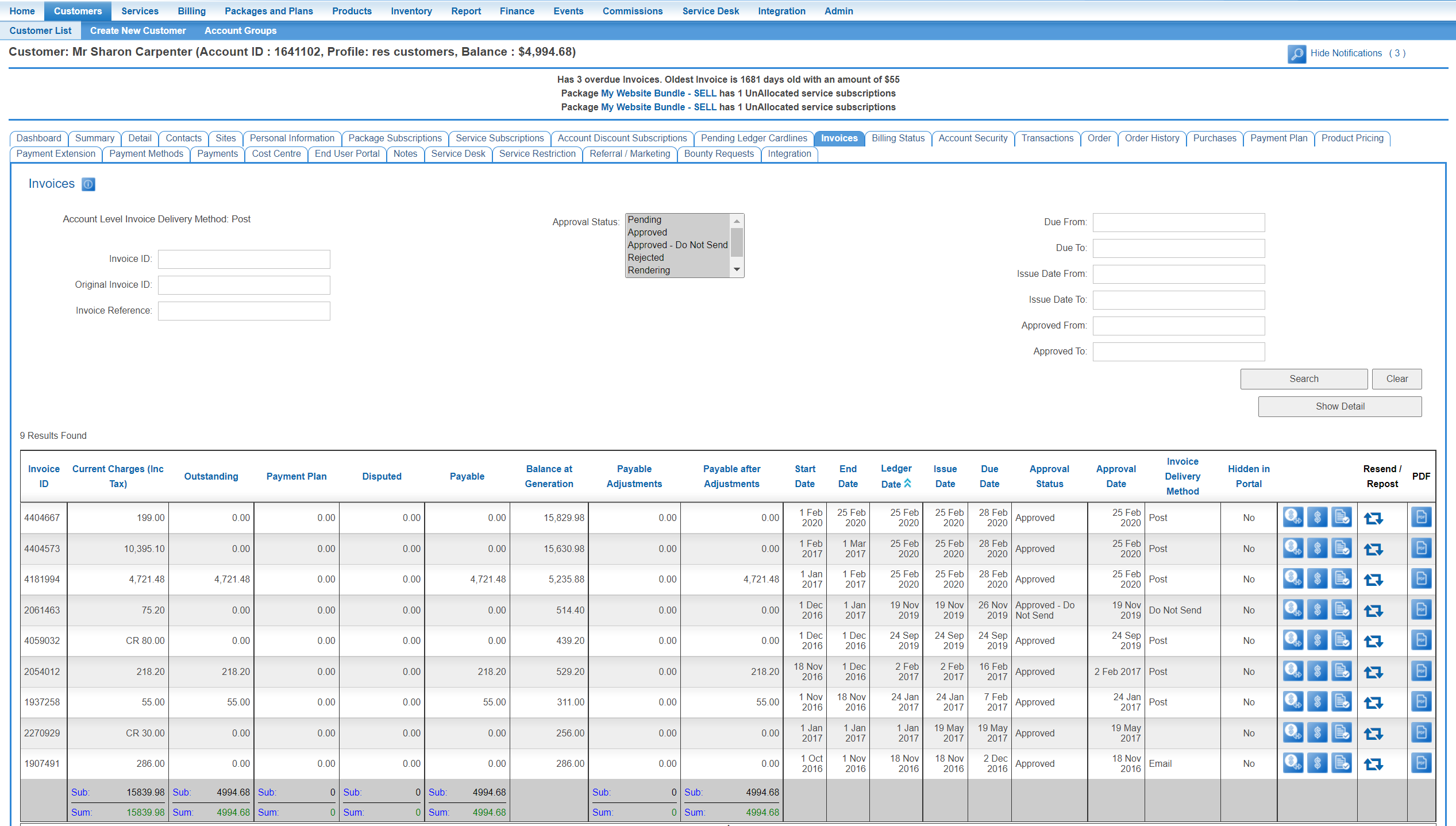 To access this screen, navigate to a customer's account and click the Invoices tab.