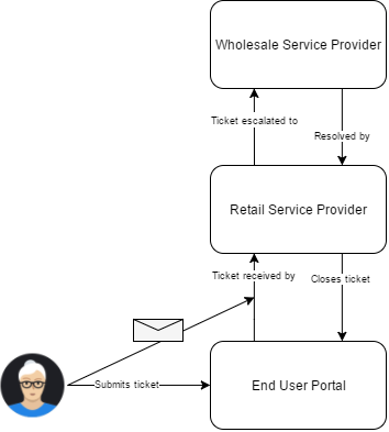 The wholesale service provider (or supplier) actions the ticket and that information is sent back down to the retail service provider automatically. Eventually the ticket is closed. End users can see updates and resolved tickets in the end user portal.