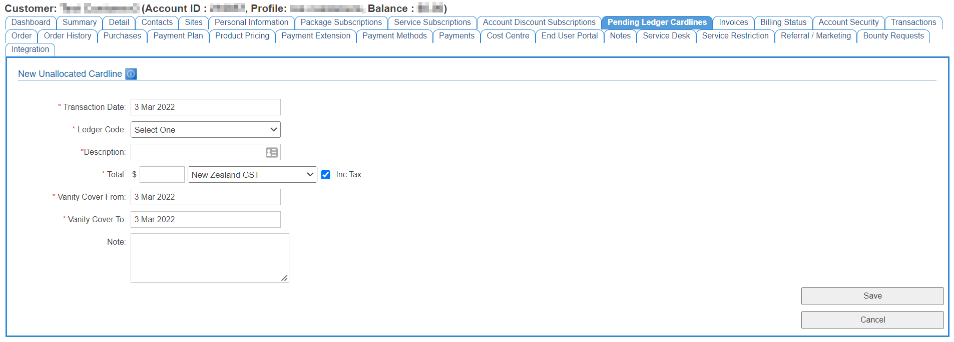 - Select the Ledger Code in the drop list. The cardline will be recorded against the selected ledger in the system for accounting purposes.