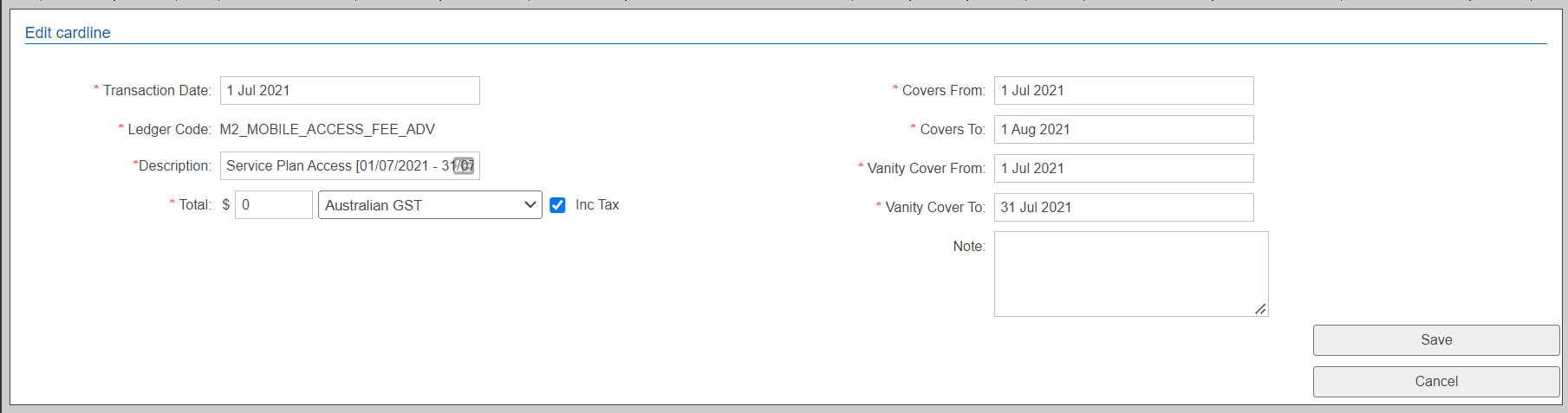 - You may edit the following fields: Transaction Date, Description, Actual Value (ex GST), Tax Amount, Covers From, Covers To, Vanity Covers From, Vanity Covers To and Note. Keep in mind that only some cardlines can have their ledger code modified from this page.