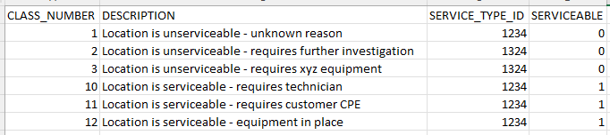 | DESCRIPTION | The service availability description to describe the serviceability of a location/address. | Yes |