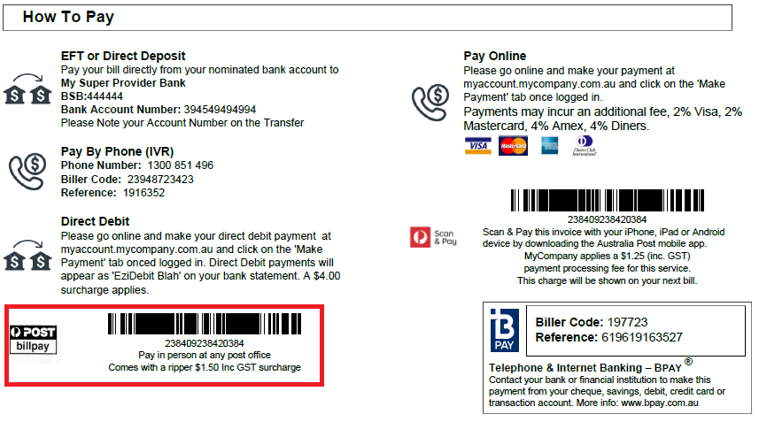 This setting displays the Australia Post Billpay block in the How to Pay section of the invoice. Before this setting can be used, the service provider must configure the AusPost bill pay biller code under Admin > My Invoice Template > Invoice Layouts > Miscellaneous Settings tab. If the biller code is not configured, the AusPost Billpay payment option will not show on the invoice, even if this setting is enabled.