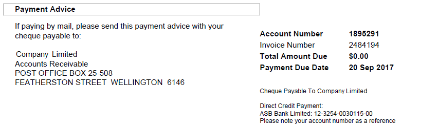 This setting will show the mailing details regarding cheque payments under the Payment Advice section.