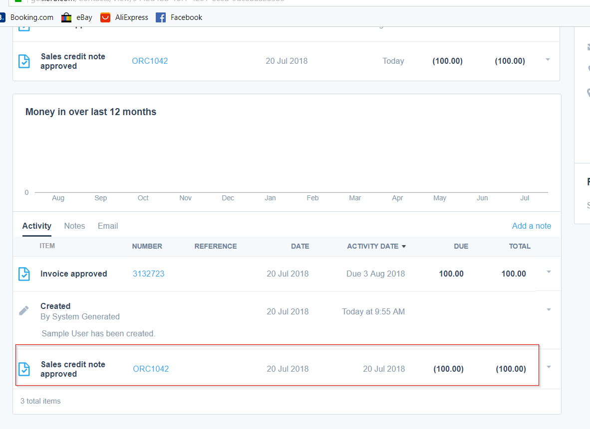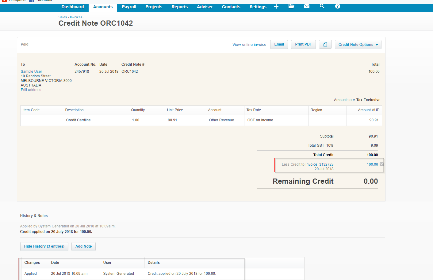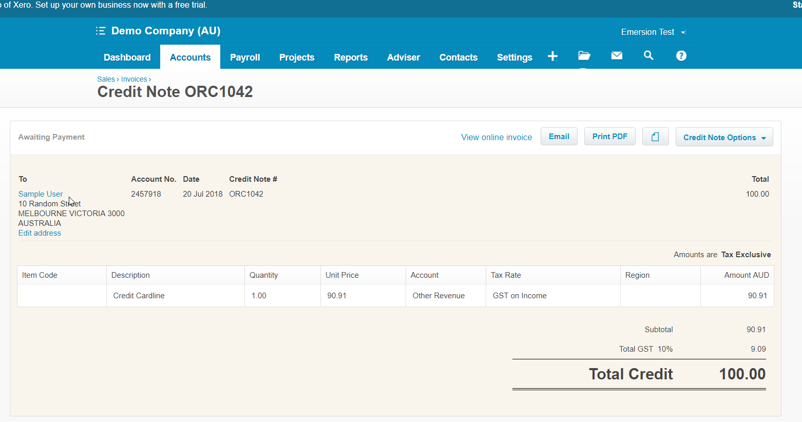 When an invoice with a credit balance is raised in Emersion, it is pushed to Xero as a credit note: