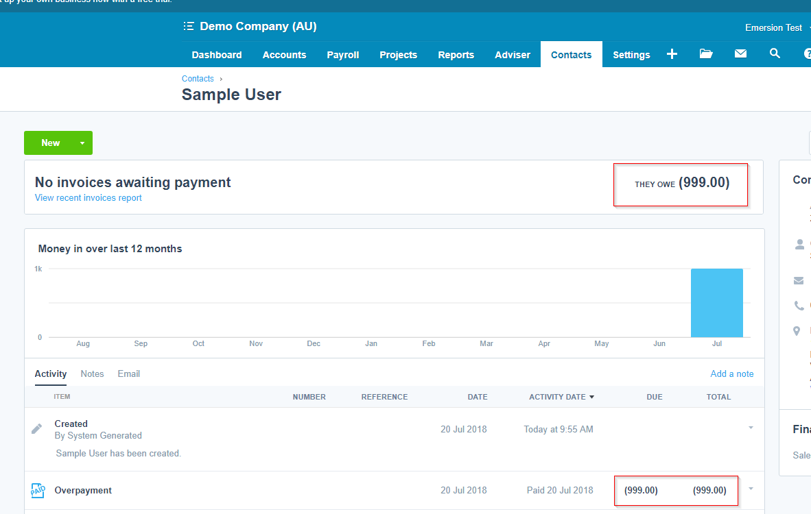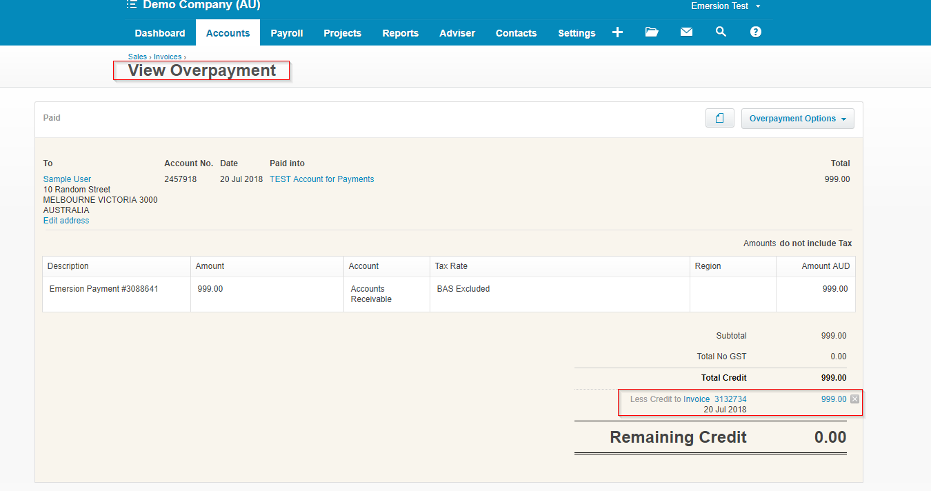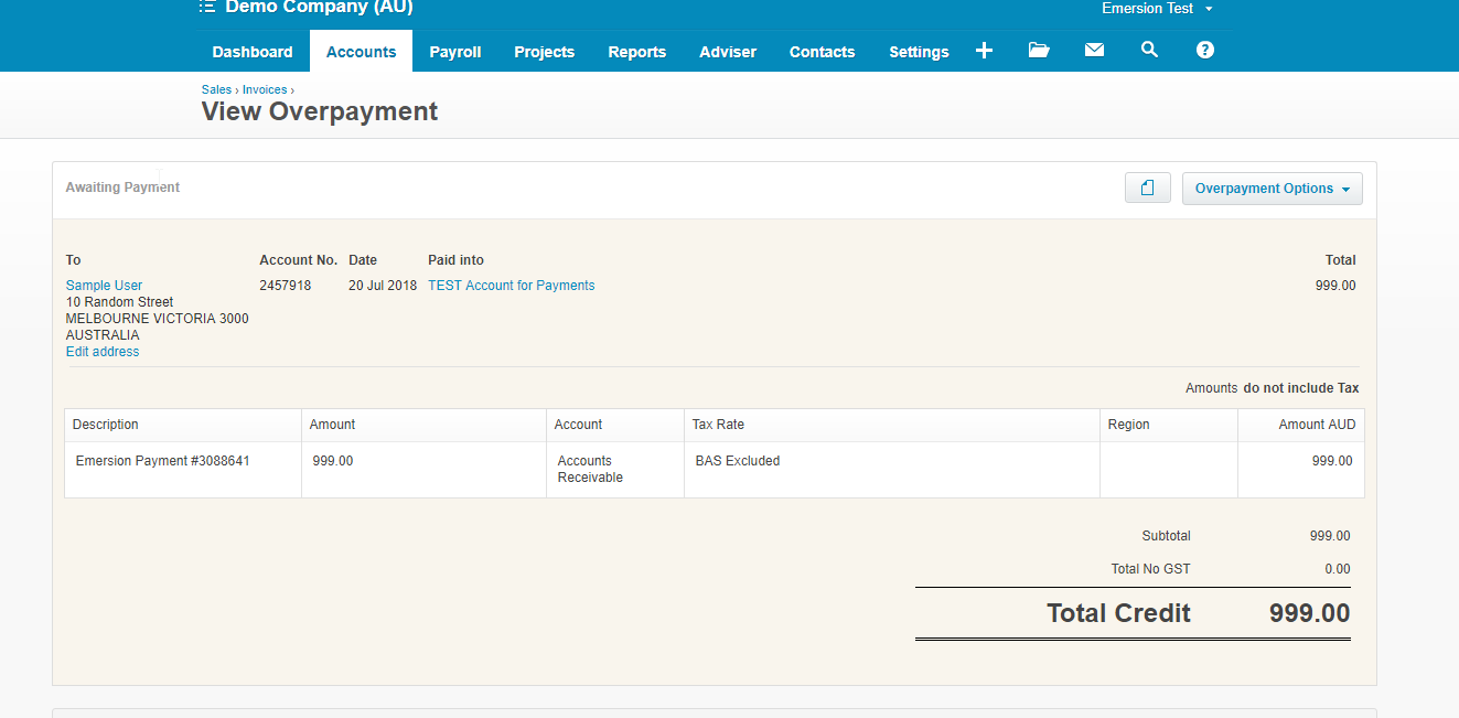 As a payment is raised in Emersion this will additionally flow through to Xero as an OverPayment.