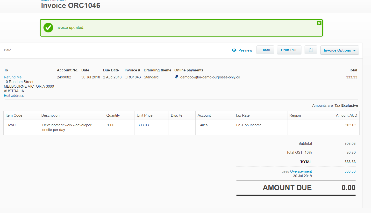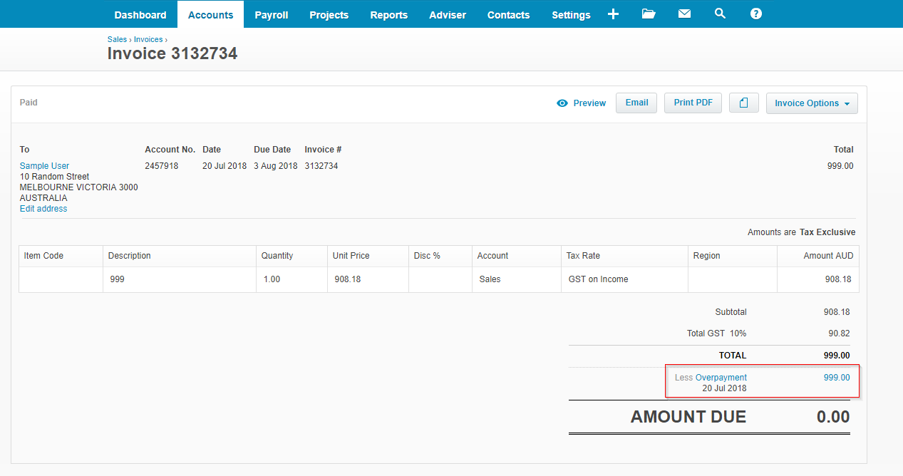 As the payment is allocated in Emersion, it will in turn also allocate in Xero. We can see here how this is reflected in Xero from view Overpayment: