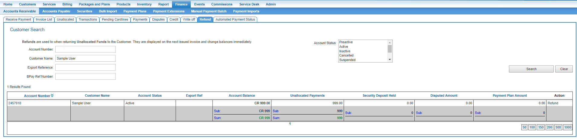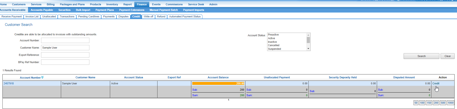 Credits applied to invoices under Finance > Accounts Receivable > Credit