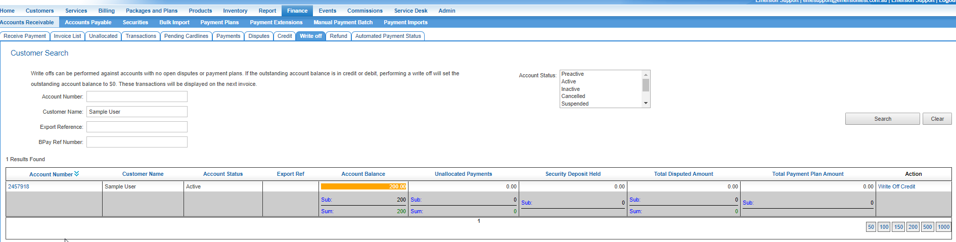 Write offs applied to accounts under Finance > Accounts Receivable > Write Off.