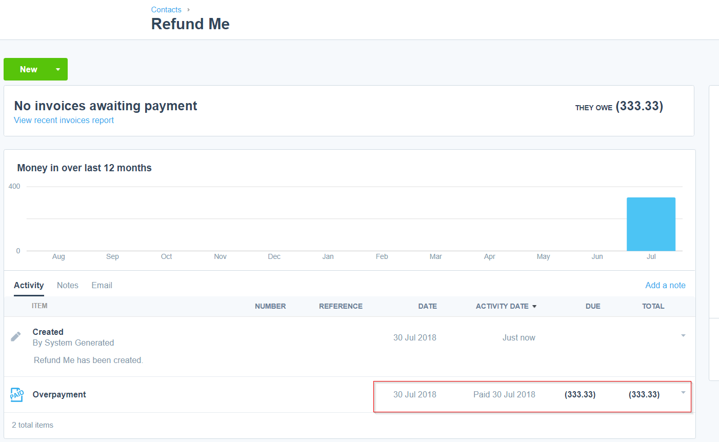 In this example, a payment for 333.33 was received for this account. There are no invoices on this account presently.